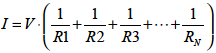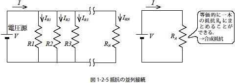 図1-2-5 は定電圧源に複数の抵抗を並列に接続した回路図です.この系の合成抵抗をRA としたとき個々の抵抗との関係は式1-2-14 のようになります.